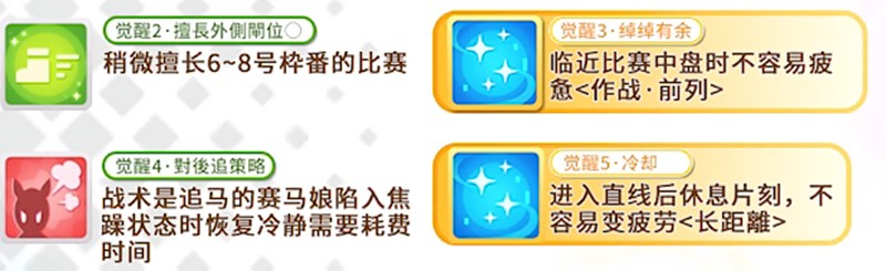 "绰绰有余"进一步增强了中段的体力保持能力;"对后追策略"能有效延缓追马型对手的追赶速度;"冷却"则可以在直线后通过休息降低疲劳概率。这些觉醒技能让她的比赛能力得到全面提升。