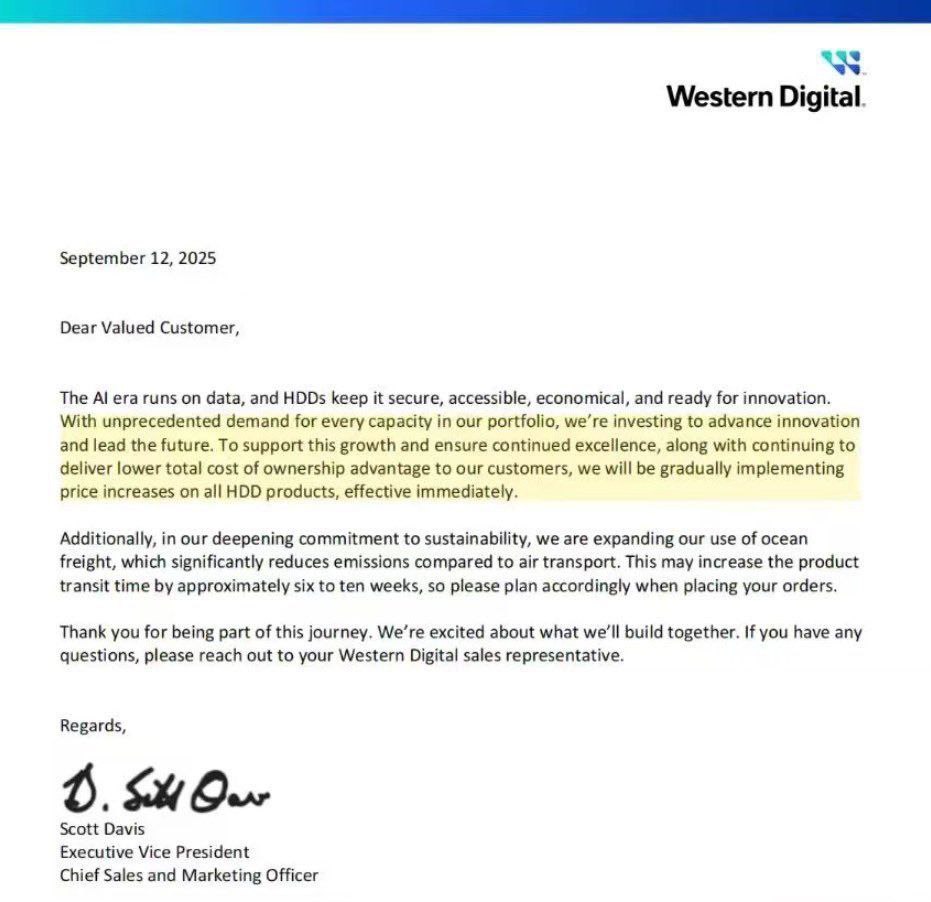 西部数据高级副总裁、首席销售和营销官 Scott Davis 在文件中表示,此次价格调整的背景是