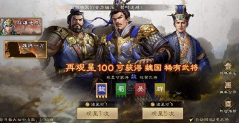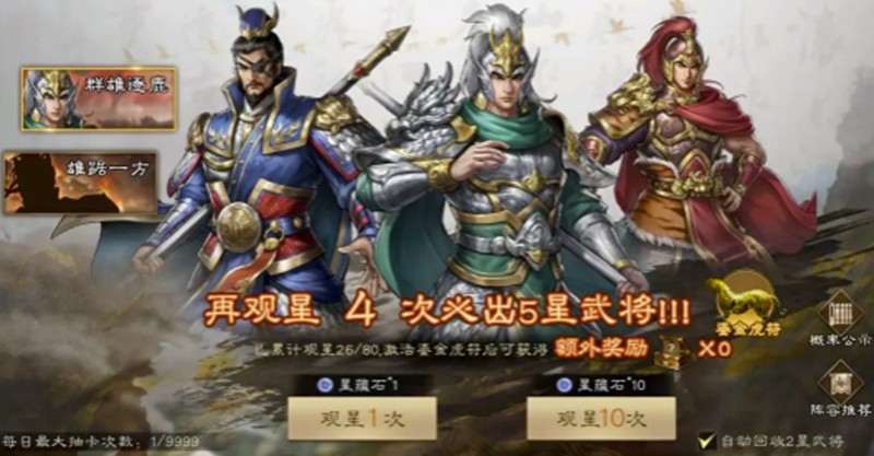 玩家可以使用星蕴石在通用卡池中进行抽卡,这个卡池包含了游戏中的所有武将。虽然抽中吕布的概率较低,但通过1000抽的保底机制,玩家必定可以获得无双吕布。这个方式主要适合那些参与相关活动的玩家。
