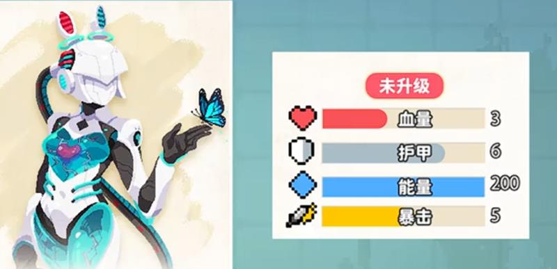 机械姬拥有4点生命值、7点护甲、220点能量值和5%暴击率的基础属性。这样的数值配置表明她属于高爆发但生存能力较弱的角色类型,需要通过灵活走位和技能释放来规避伤害。220点的超高能量值让她可以频繁使用技能,而7点护甲则提供了基本的防御保障。