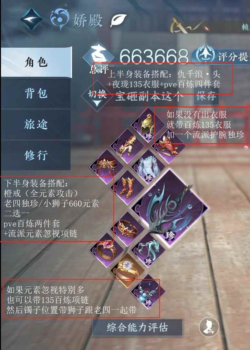 下半身装备搭配:橙戒(全元素攻击)老四独珍/小狮子660二选一+pve百炼两件套+流派元素忽视项链