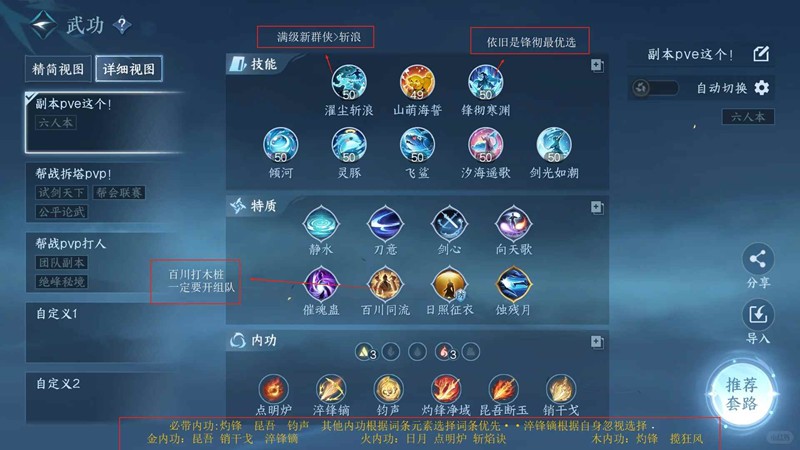 必带内功:灼锋 昆吾 钧声 其他内功根据词条元素选择词条优先 淬锋镝根据自身忽视选择