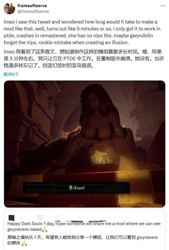 这一发现迅速在玩家社区中引发了热烈讨论和再创作。有玩家在庆祝《黑暗之魂1》周年纪念时,戏谑地请求一个“能看到葛温艾薇雅胴体”的模组。令人意想不到的是,fromsoftserve仅用约五分钟就实现了这个模组,尽管它仅能在原版(PTDE)中运行,且在重制版中会崩溃。该用户还幽默地补充道:“不过她的胸部并没有‘紫葡萄’,也许是暗月之神葛温德林创造这个幻象时忘了画了,真是新手才会犯的错误。”