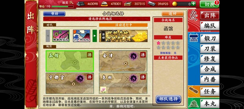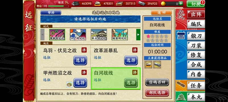 远征:用来派遣刀剑男士获得资源,要注意左下角地图要求不然会远征失败