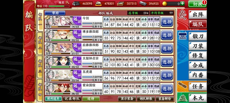编队:短刀在刀剑中数值很突出(大爹),所以在前期我们要组一队短刀(p4只列举不一定非要这几振,博多必练,挖小判有加成)