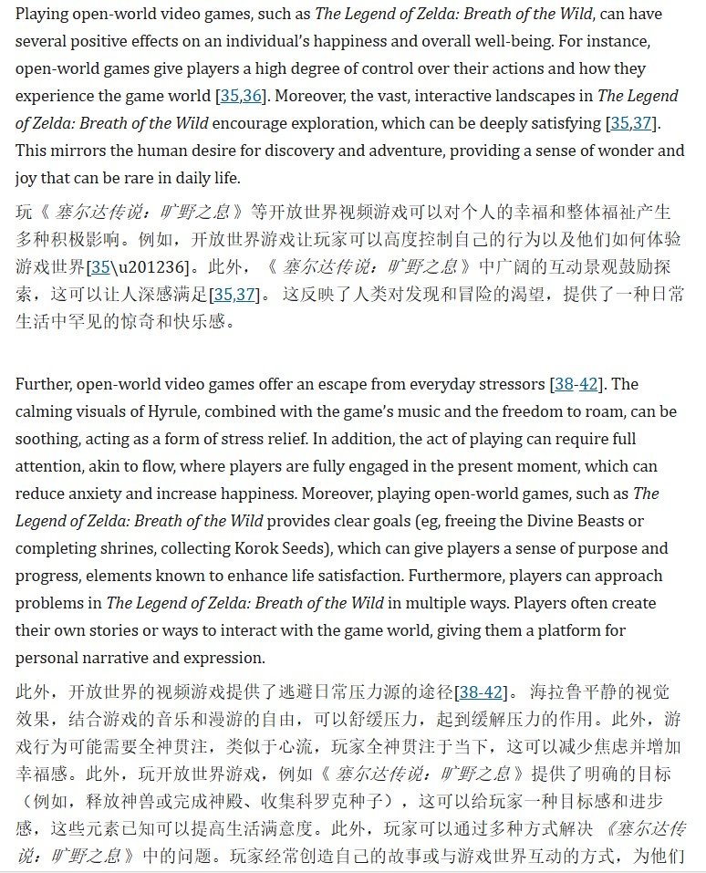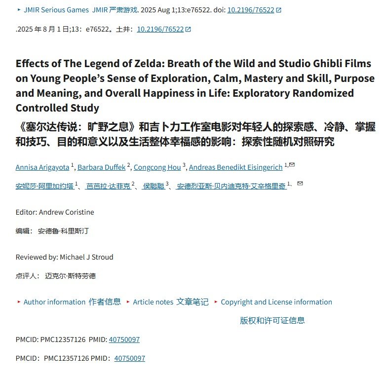 专注于游戏研究的期刊《JMIR Serious Games》最新发表论文显示,科研团队通过以焦虑感、倦怠感显著的研究生群体为样本进行测试,发现游玩《塞尔达传说:旷野之息》能有效激发目标感与意义感。更值得注意的是,这款游戏还能让参与者在现实生活中感受到更强烈的平静感、冒险精神及能力自信。