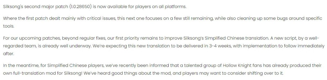 近日《空洞骑士:丝之歌》第2个补丁上线,开发团队Team Cherry在补丁说明中提到,新中文翻译将在3-4周内上线。