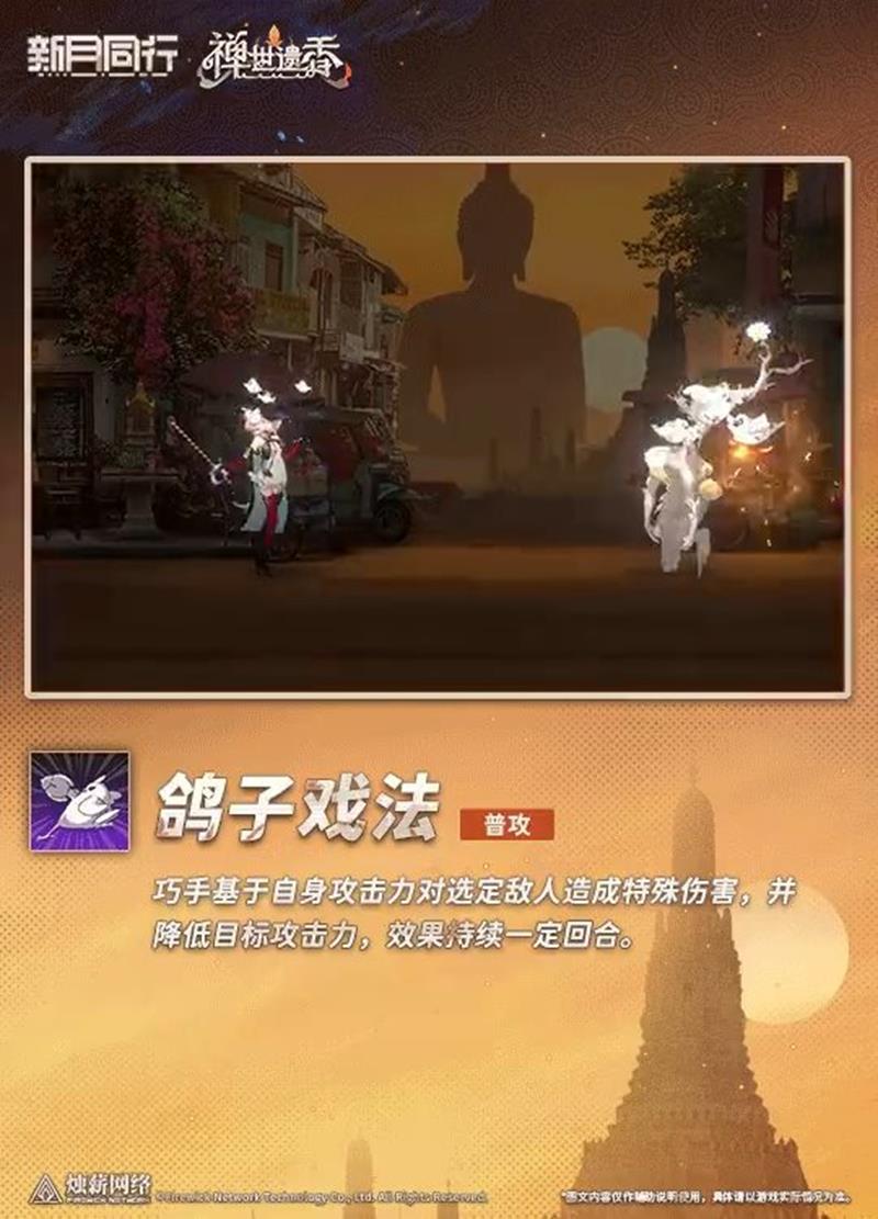 【鸽子戏法】 普攻 巧手基于自身攻击力对选定敌人造成特殊伤害,并降低目标攻击力,效果持续一定回合。
