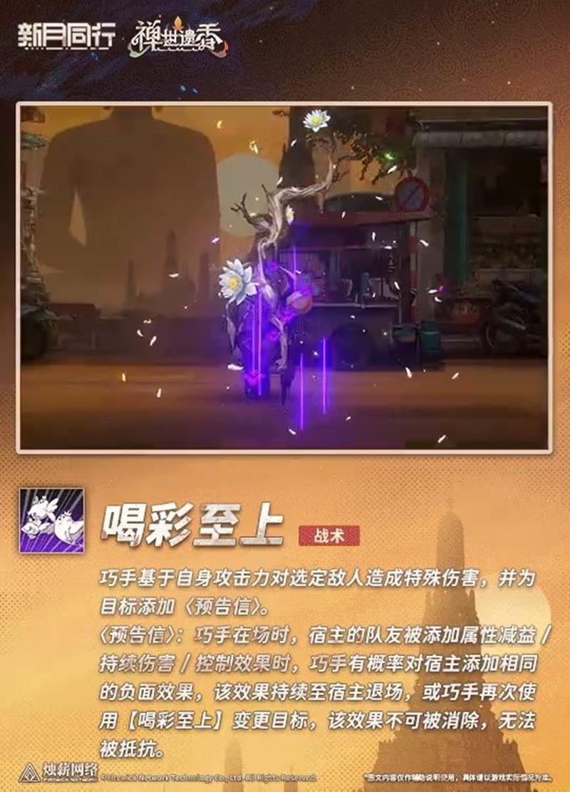 【唱彩至上】 战术 巧手基于自身攻击力对选定敌人造成特殊伤害,并为目标添加(预告信)。 〈预告信〉:巧手在场时,宿主的队友被添加属性减益/持续伤害/控制效果时,巧手有概率对宿主添加相同的负面效果,该效果持续至宿主退场,或巧手再次使用【唱彩至上】变更目标,该效果不可被消除,无法抵抗。