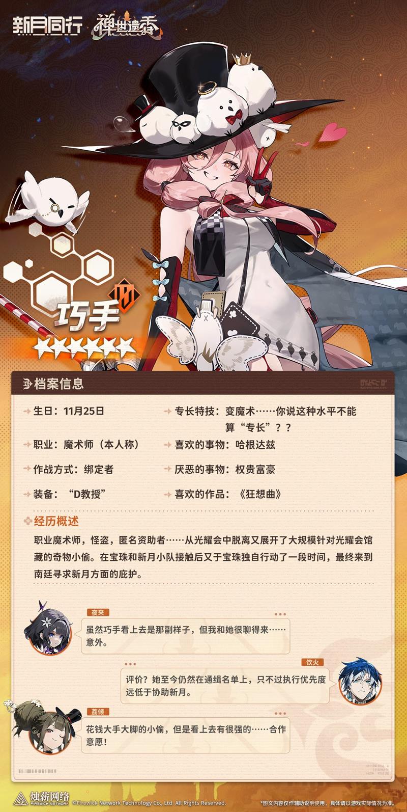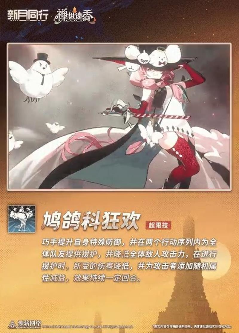 【鸠鸽科狂欢夜】 超限技 巧手提升自身特殊防御,并在两个行动序列内为全体队友提供援护,并降低全体敌人攻击力,在进行援护时,所受的伤害降低,并为攻击者添加随机属性减益,效果持续一定回合。