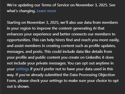 此外,领英确认,用户的私人消息或帖子不会被用于训练AI模型。