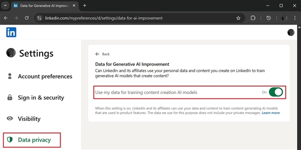如果用户不想让自己的数据被用于AI模型训练,可以通过以下步骤关闭该功能:进入设置>数据隐私>生成式AI改进,然后关闭“使用我的数据训练内容创作AI模型”的开关。