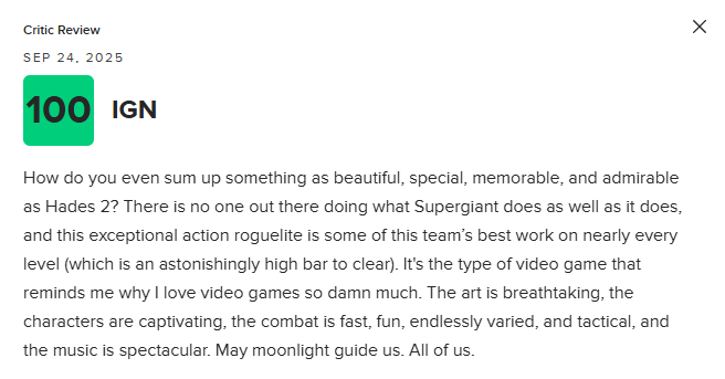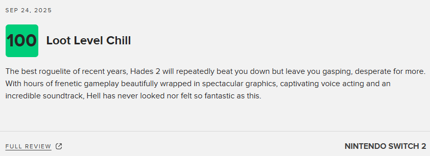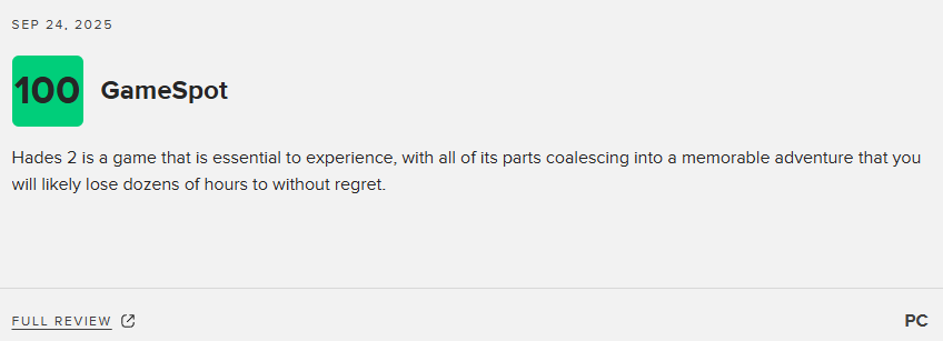 肉鸽《哈迪斯2》去年在PC端推出了抢先体验版,该作即将于9月26日推出1.0正式版。《哈迪斯2》M站评分也已正式解禁,IGN和GS均给出满分。截至目前,Switch2版媒体均分为94分,共收录30家媒体;PC版均分为95分,共收录19家媒体。