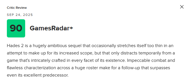 《哈迪斯2》是一部极具野心的续作,偶尔会因规模扩张而显得有些分散,但这仅仅会在短暂时分让人分心,因为这款游戏在存在的每一个层面都展现出精雕细琢的工艺。无懈可击的战斗系统与庞大角色阵容中完美的刻画,共同成就了一部甚至超越前作的续篇。