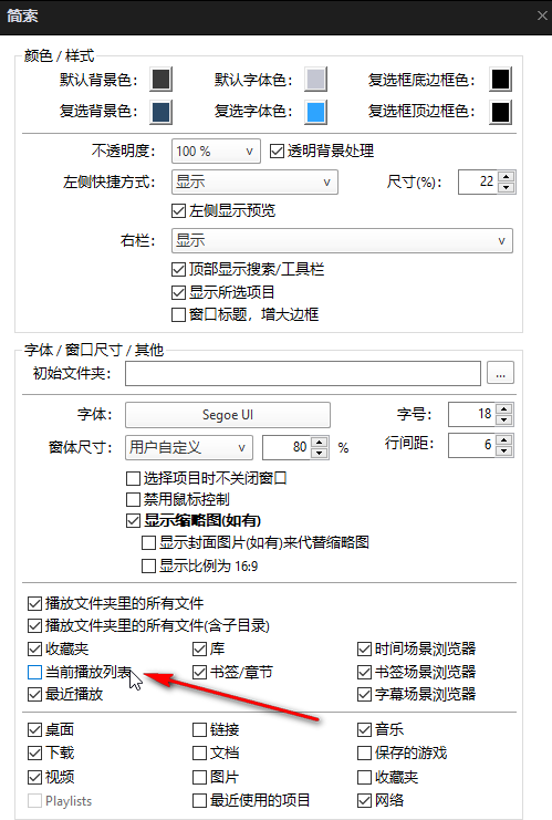 4、然后在打开的窗口界面中,找到"当前播放列表",将其小方框勾选上,最后点击"确定"保存即可。