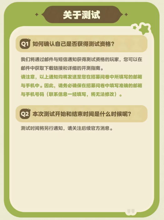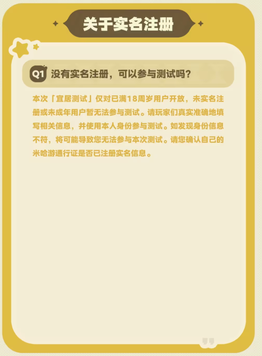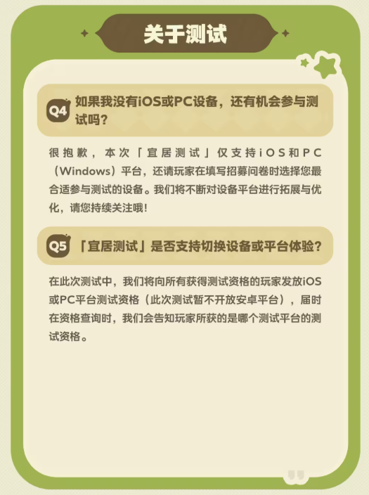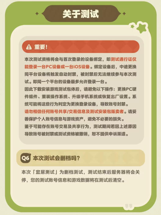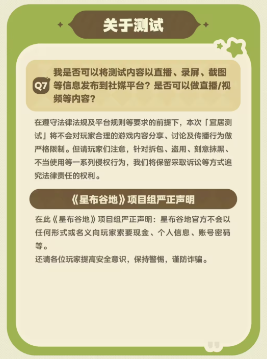 关注《星布谷地》B站官方账号与社区动态,也有机会获取掉落的测试资格。官方表示,本次测试仅对已满18周岁用户开放,未实名注册或未成年用户无法参与测试。「宜居测试」的资格仅限本次测试使用,无法延用于后续测试。严禁转让、出售测试客户端或测试账号。一经发现,将立即取消相关账号的测试资格。