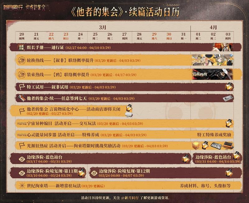 3月31日(周一):当天重点活动包括“特工试用——叙非试用”,时间为3月20日更新后至4月03日03:59;“他者的集会·续”签到活动亦在此期间进行。