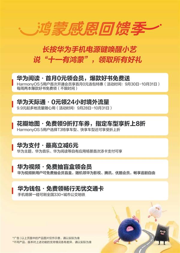 这个国庆中秋长假,与其出门被人山人海挤到变形,不如宅家舒舒服服用华为阅读充电,用华为视频入戏。要是想体验再升级,还有个隐藏技巧——赶紧升级到HarmonyOS 5.1,从桌面右滑进入负一屏参加“鸿蒙有礼”活动,在9月30日前完成首次签到,之后每天签到都能领现金红包和随机惊喜好礼。现在对小艺说出假期暗号“十一有鸿蒙”,还有机会解锁华为阅读、华为视频等多项权益。从出行到娱乐,全都帮你安排得明明白白。这个假期,咱们一起chill着过,轻松又充实!