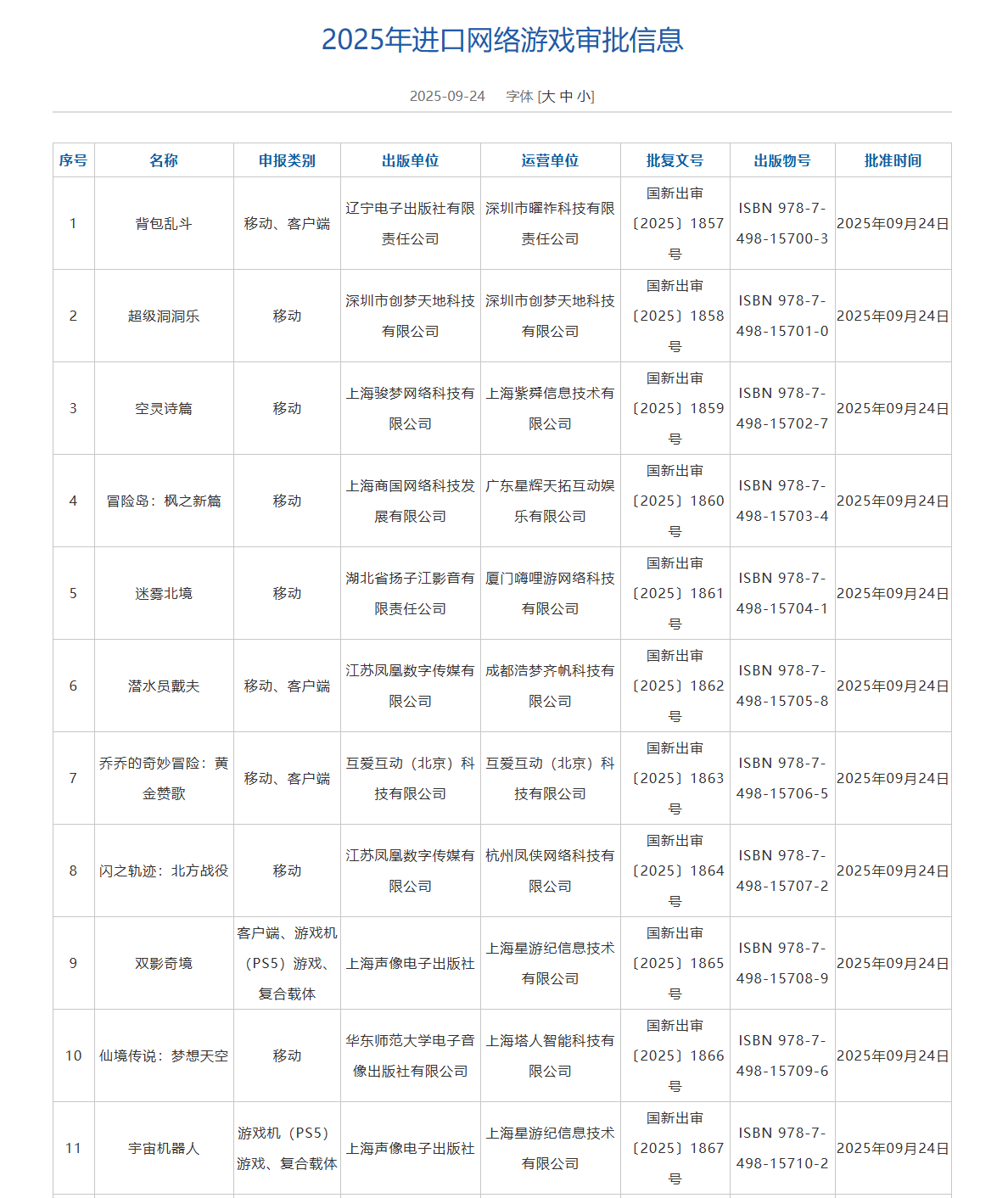 新一批进口网络游戏版号发放,本次共有3款游戏通过审批,《双影奇境》《宇宙机器人》等11款游戏过审。