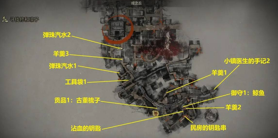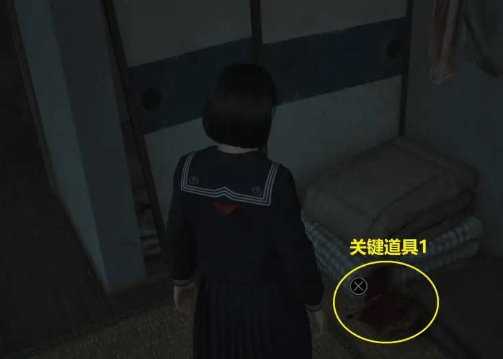 拿到了沾血的钥匙后,如图黄颜色方框内,楼梯旁原来上锁的门开了,里面有个怪物,躲避后进去获得关键道具2:民房的钥匙串。