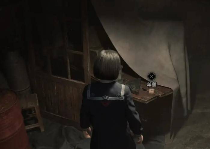 往南走,来到如图位置能拿到下面的收集。首先是岔路口,有一个蹲下钻进去的地下室,里面有羊羹1。