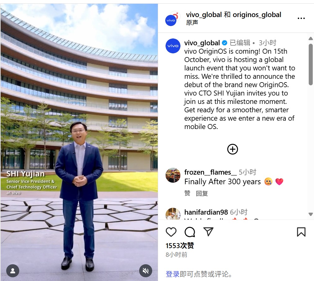 9月25日消息,vivo官方今日通过海外社交媒体ins上正式宣布,OriginOS全球发布会将于10月15日在上海举行。此次发布会不仅是一次系统的焕新升级,更是vivo全球战略的重要节点。