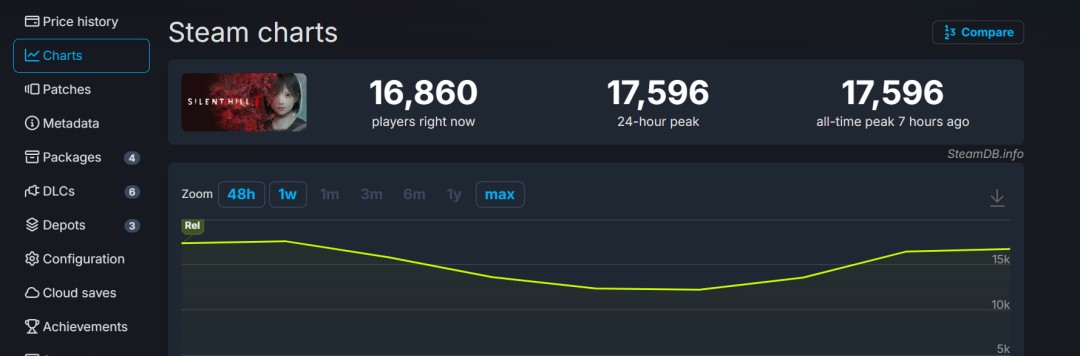 SteamDB显示《寂静岭f》Steam同时在线峰值不到2万人(17596),可以推测销量不是太好:
