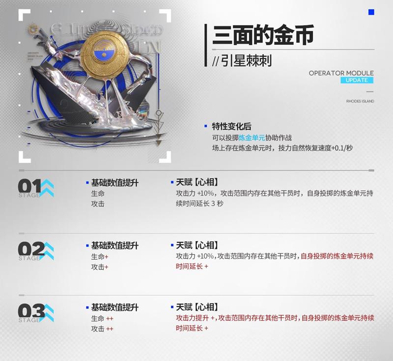 天赋【心相】 攻击力提升+,攻击范围内存在其他干员时,自身投掷的炼金单元持续时间延长+