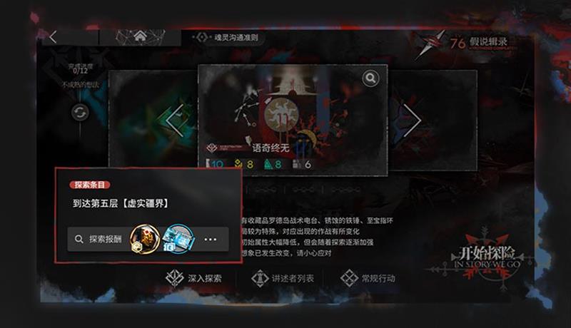 不同的探索条目附带独特的初始参数(目标生命值、希望、源石锭、编队人数等)及故事探险的探索条件,将会带来多样而有趣的探险体验。