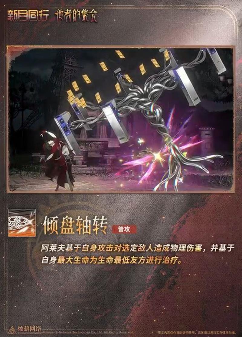 阿莱夫基于自身攻击对选定敌人造成物理伤害,并基于自身最大生命为生命最低友方进行治疗。