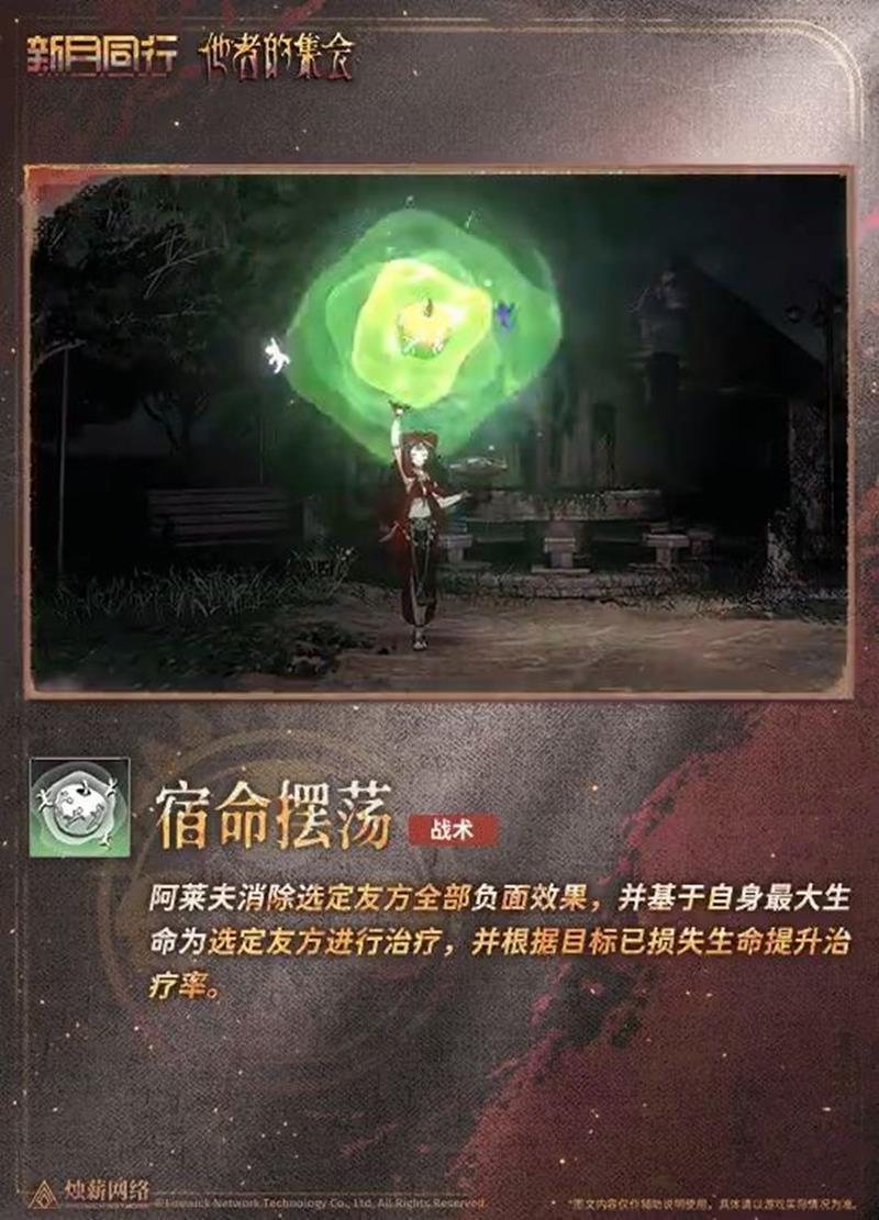阿莱夫消除选定友方全部负面效果,并基于自身最大生命为选定友方进行治疗,并根据目标已损失生命提升治疗率。