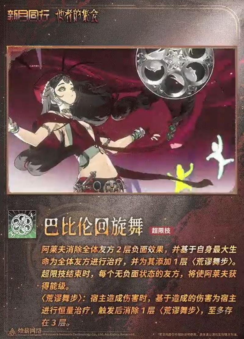 阿莱夫消除全体友方2层负面效果,并基于自身最大生命为全体友方进行治疗,并为其添加1层〈荒谬舞步〉。超限技结束时,每个无负面状态的友方,将使阿莱夫获得能级。 〈荒谬舞步〉:宿主造成伤害时,基于造成的伤害为宿主进行恒量治疗,触发后消除1层〈荒谬舞步〉,至多存在3层。