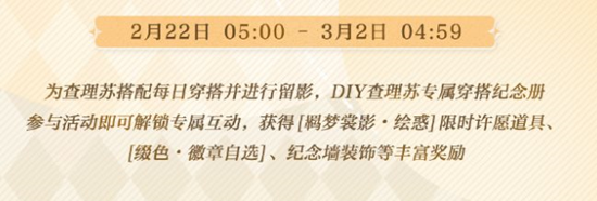 为查理苏搭配每日穿搭并进行留影,DIY查理苏专属穿搭纪念册,解锁全部穿搭留影,还可获得[查理苏・缀色焕新]道具。