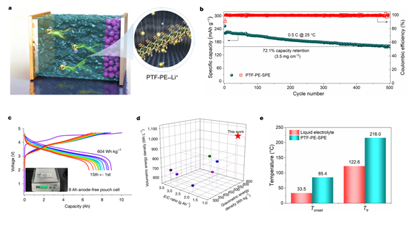 这款电池的核心突破在于电解质创新。团队提出“富阴离子溶剂化结构”设计策略,开发出新型含氟聚醚电解质,通过热引发原位聚合技术增强固态界面接触与离子传导能力。
