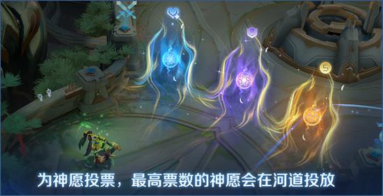 玩家通过穿过对应的神愿区域进行投票,票数最高的神愿对应的心愿之神会降临峡谷,投放神愿。