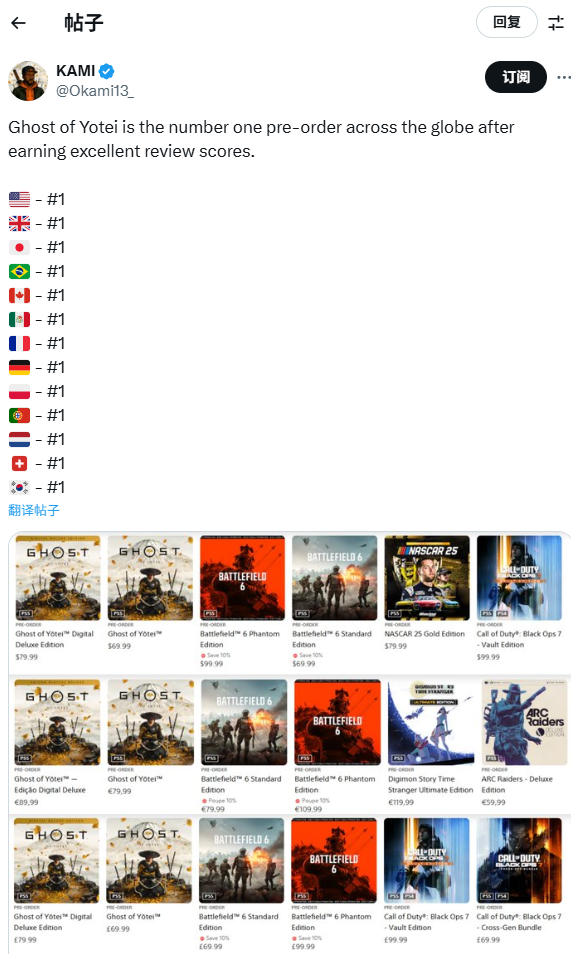 据玩家Okami13_在社交媒体上指出,《羊蹄山之魂》目前是几乎所有地区PlayStation商店中销量最高的预购游戏,这或许与媒体陆续释出的高分评价有关。考虑到《对马岛之魂》的火爆以及本作作为PlayStation下一款第一方大作的重要地位,这样的成绩并不意外,但依旧令人印象深刻。