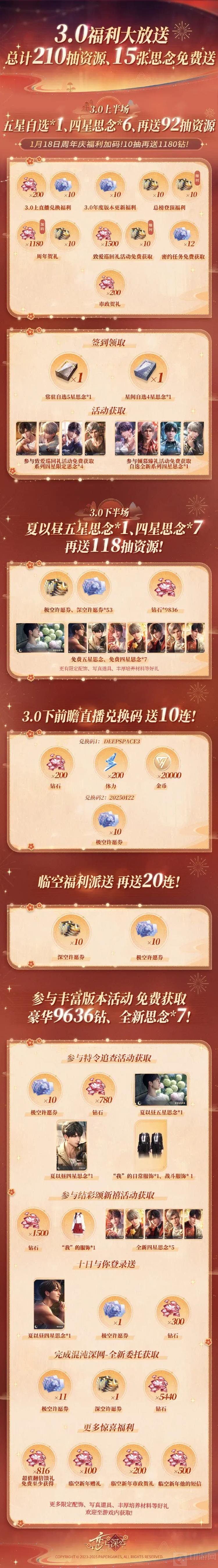 3.0年度版本的下半部分从1月22日开始,玩家将再获得118抽资源和8张思念。这一阶段的活动包括直播福利、临空福利派送、特令追查、结彩颂新禧、十日与你、混沌深网等。这些活动不仅提供极空许愿券、钻石、体力、金币,还有全新的五星思念、四星思念、服饰、饰品等豪华福利。此外,市政邮件贺礼和男主短信也将带来额外的钻石奖励。