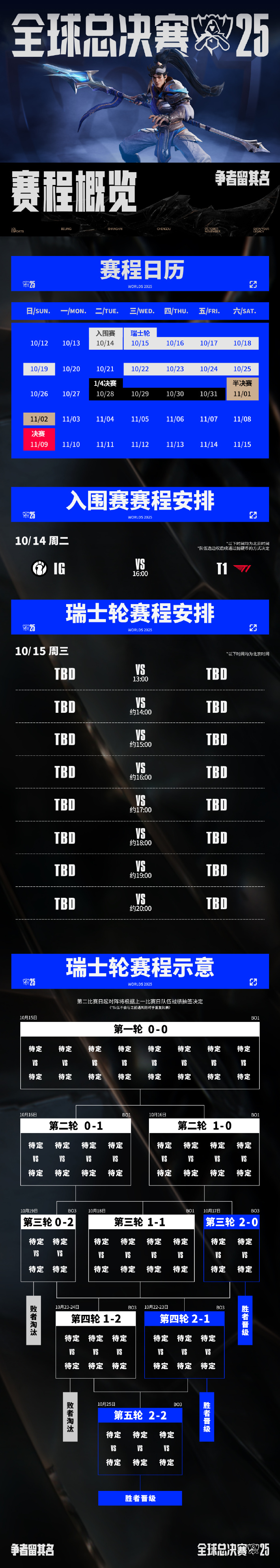 入围赛阶段:10月14日;瑞士轮阶段:10月15日-10月19日、10月22日-10月25日;淘汰赛阶段:10月28日-11月2日;冠亚军决赛:11月9日。 让我们共同期待,谁将问鼎巅峰!