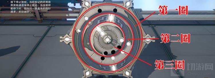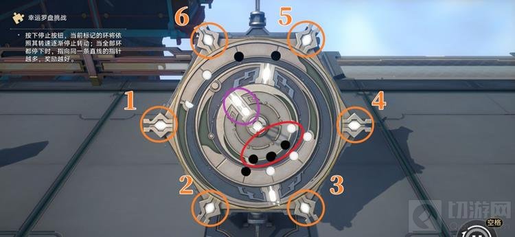 首先来看“命运轮盘”成就。这个挑战中,罗盘共有三圈,玩家可以通过按空格键使外圈的罗盘停止旋转。当停止旋转后,指针会根据发光点的数量多旋转几个区域。