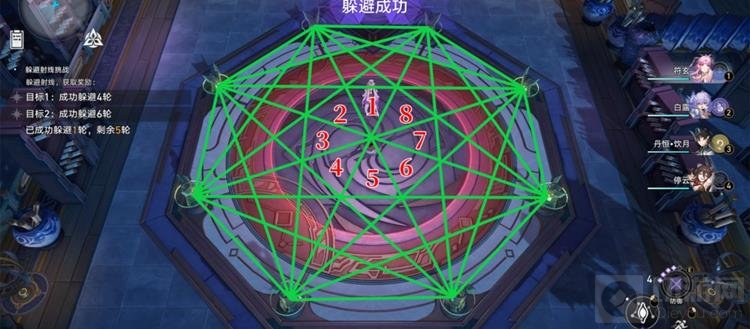 接下来是“反射闪避”成就。在这个挑战中,周围有八个发射机关,玩家需要躲避发射的光线。通过连结光线,可以发现有8个点位可以躲避全部的光线。