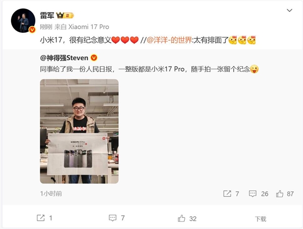 9月29日消息,小米公司新媒体总监神得强Steven晒出了一份《人民日报》,