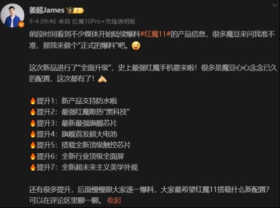 红魔游戏手机官方微博正式宣布,将于10月17日14:30举行红魔11 Pro系列新品发布会。配合官方发布的“