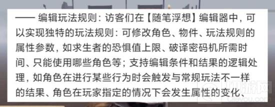 玩法规则编辑:玩家可以在编辑器中实现个性化的玩法规则,包括修改角色、物件和玩法规则的属性参数。例如,调整求生者的恐惧值上限、破译密码机所需时间等。此外,还可以编辑条件和结果的逻辑处理,实现角色在特定行为下触发不同于常规玩法的结果,以及角色属性的变化和状态限制。
