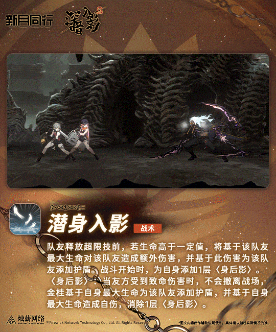 《身后影》:当友方单位受到致命伤害时,不会立即撤离战场。金桂会基于自身最大生命值为受伤队友提供护盾,并自伤以消除一层《身后影》。