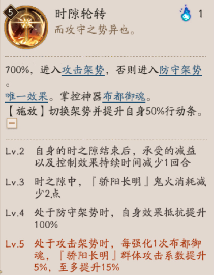 Lv.5 处于攻击架势时,每强化1次布都御魂,「骄阳长明」群体攻击系数提升5%,至多提升15%