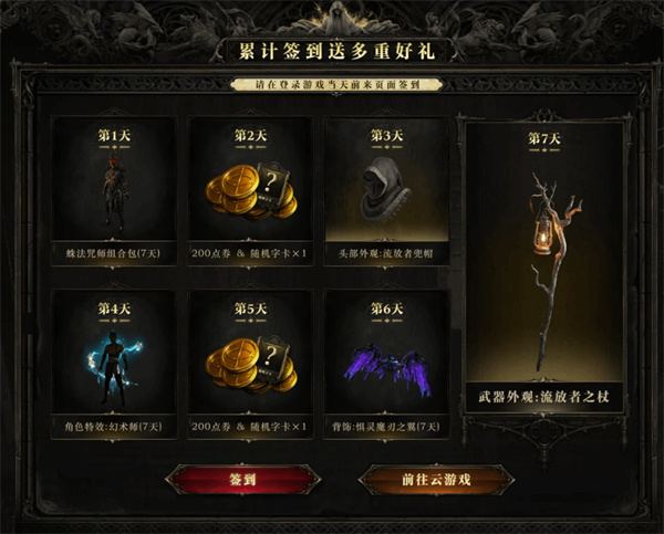 活动期间每日登录并在活动页面签到,可累计获得以下奖励: