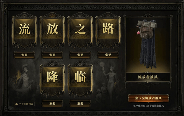 集齐6张不同字卡,可在活动页面兑换身体外观【流放者披风】。