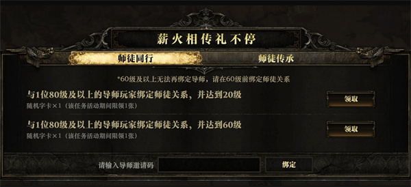 导师奖励:学徒升级至60级时,导师可领取1张随机字卡(最多2张)。