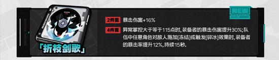 2件套。暴击伤害+16%。4件套!异常掌控大于等于115点时,装备者的暴击伤害提升30%;队伍中任意角色对敌人施加[冻结]或触发[碎冰]效果时,装备者的暴击率提升12%,持续15秒。