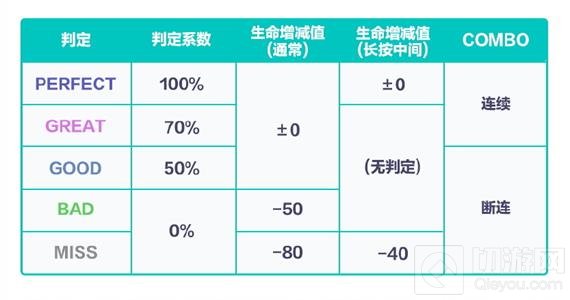 这是官方的一张表格,可以看出,如果是单个的音符判定为MISS,则会扣除80点血量;判定为BAD则会扣除50点血量。